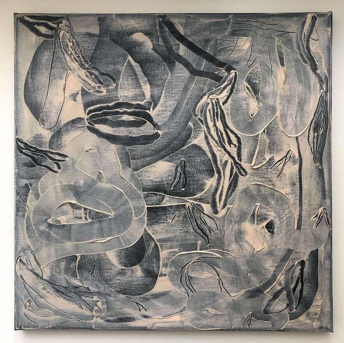 Ten obraz to abstrakcyjna kompozycja utrzymana w monochromatycznej kolorystyce, z dominującymi odcieniami czerni, szarości i beżu. Przedstawia organiczne, płynne kształty, które mogą przywoływać na myśl wijące się węże lub splecione fragmenty ciał. Widoczne są dynamiczne linie i teksturalne nawarstwienia, które nadają dziełu głębi i struktury. Technika zastosowana przez artystę sugeruje eksperymentowanie z fakturą oraz kontrastem pomiędzy światłem a cieniem. Całość tworzy hipnotyzujący, niemal oniryczny efekt, który zachęca do indywidualnej interpretacji.