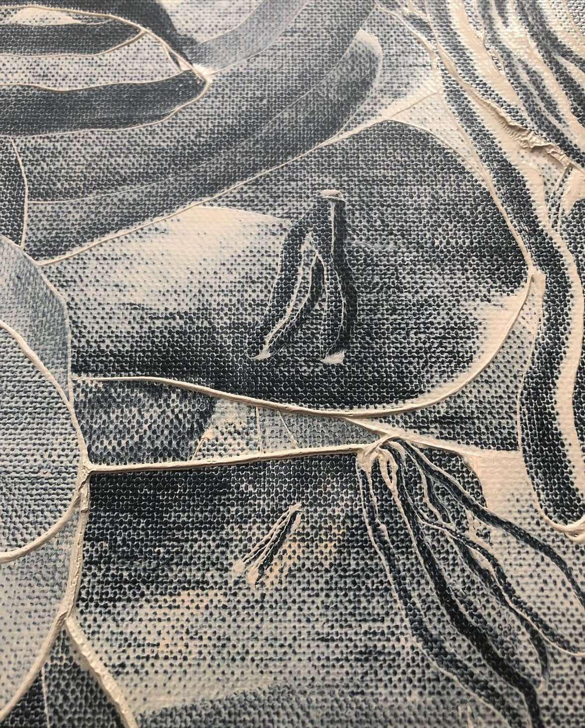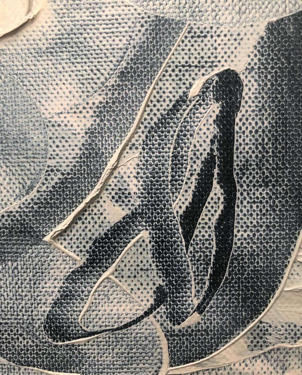 Sposób nakładania farby tworzy iluzję światłocienia, gdzie jaśniejsze fragmenty zdają się wydobywać z głębi, podczas gdy ciemniejsze cofają się w tło, kreując trójwymiarowy efekt. Widoczne są również subtelne ślady graficznego opracowania – siateczkowe struktury i kreskowania przypominające efekt druku lub przetworzonego obrazu fotograficznego, co dodaje dziełu dodatkowej warstwy interpretacyjnej.